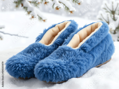 A pair of blue slippers resting on a snowy surface, contrasting with the white snow beneath