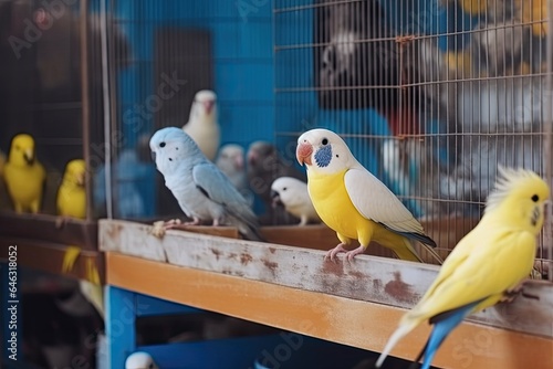 A pair of cute and colorful budgerigars perched in a birdcage, showcasing their vibrant plumage and adorable charm.