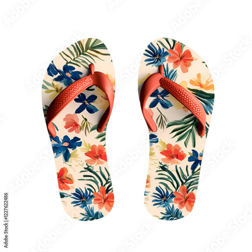 A pair of flip-flops with floral patterns placed side by side on white background