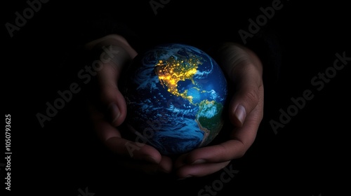 A pair of hands cradles a glowing Earth, symbolizing care for the planet.