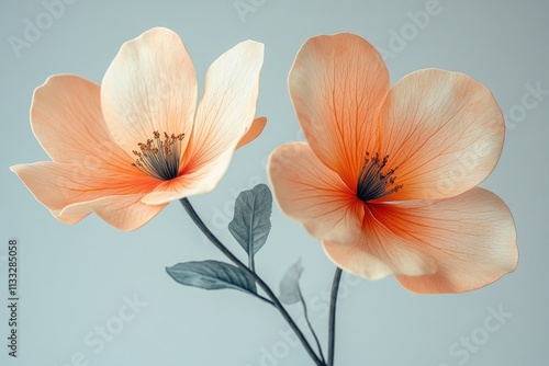 A pair of orange flowers sit atop green leaves in a simple glass vase
