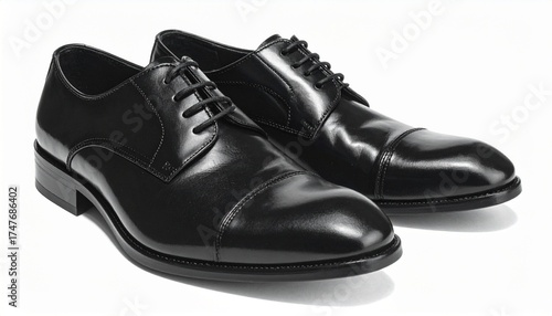 A pair of sleek black leather dress shoes with closed lacing and low heels, featuring brown inner lining. Positioned side by side on a white background, ideal for formal fashion and business wear.