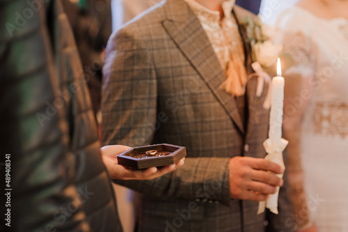 A pair of wedding gold rings in the hands of the groom. Wedding rings on a man's hand