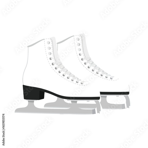 A pair of white ice skates with black heels and silver laces are displayed against a white background.