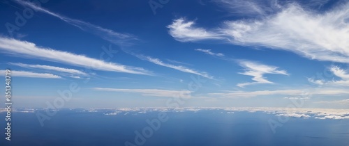A panoramic view of a clear blue sky with white clouds, capturing a serene and peaceful atmosphere perfect for nature and tranquility concepts.