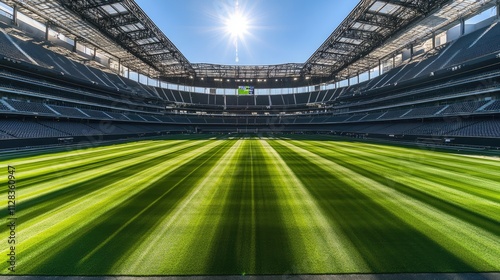 A panoramic view of a modern stadium field illuminated by sunlight.