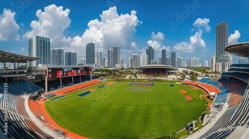 A panoramic view of a sports complex with multiple athletic fields, stadium seating, and vibrant green grass, ready for competition