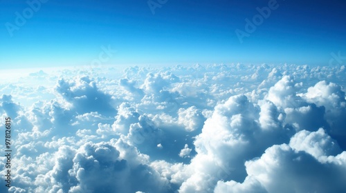 A panoramic view of fluffy white clouds floating across a bright blue sky, with the horizon barely visible.