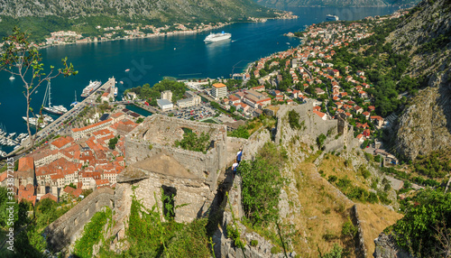 A panoramic view of the Bay of Kotor, cruise port, mountains and the medieval walled old town from the ruins of the Castle of San Giovanni