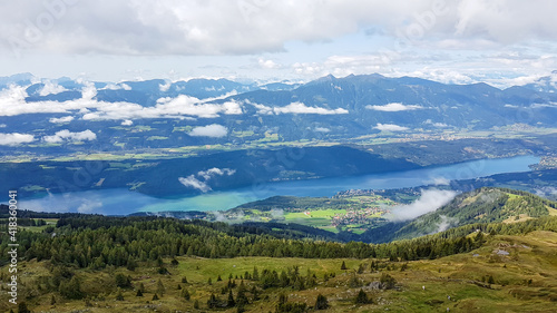 A panoramic view on the Millstaettersee from Granattor in Austrian Alps. The distant lake is surrounded by high mountains. There are few clouds above the lake and the valley. Endless mountain chains