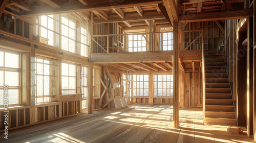 A partially constructed wooden house interior with exposed timber framing, large windows, and wooden staircase. warm natural