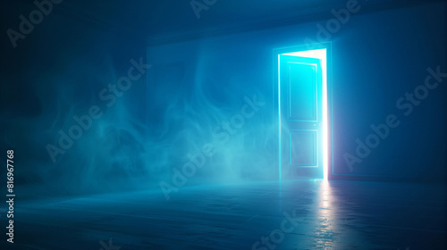 A partially open door emitting a bright blue light in a dark room, with mist or smoke spreading across the floor, creating a mysterious and eerie atmosphere.