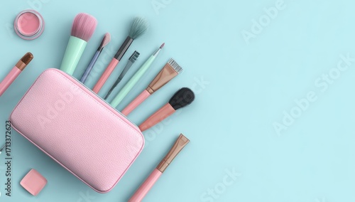 A pastel pink makeup bag spills its contents of various brushes and compacts onto a light blue background, creating a visually appealing, organized yet slightly chaotic arrangement