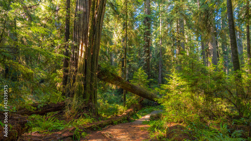 A path in the fairy green forest. The sun's rays fall through the branches. Redwood national and state parks. California, USA