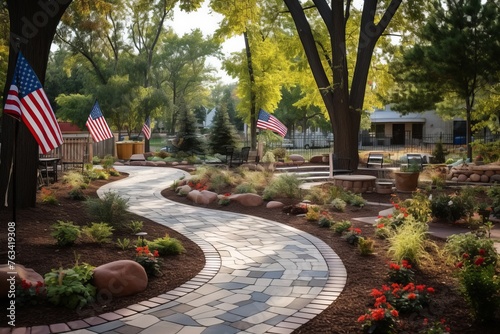 A Patriot Day memorial garden with an American flag pathway leading to a central tribute