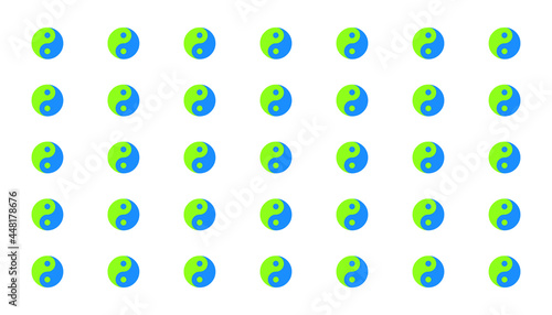 A pattern of repeating Yin and yang symbols. White background. Color is green and blue. Concept of philosophy of an ecological backdrop, a fusion of pure nature and water.
