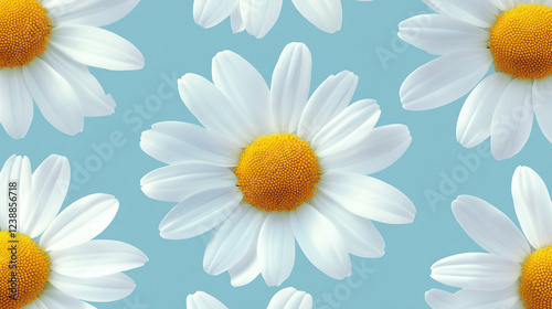 A pattern of white daisies with yellow centers on a light blue background. The daisies are scattered across the image, creating a cheerful and bright floral design.