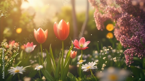 A peaceful spring garden with an assortment of blooming flowers