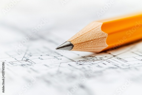 A pencil resting on top of architectural blueprints, with focus on the point where it is drawing. The background shows complex and detailed architecture plans.