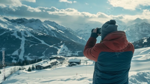 A person captures the expansive winter landscape with snow-covered mountains and a tranquil village nestled below under a partly cloudy sky.