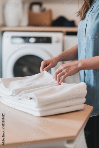 A Person Carefully Folding Freshly Laundered White Towels on a Wooden Surface in a Bright Laundry Room, Emphasizing Tidiness and Household Chores