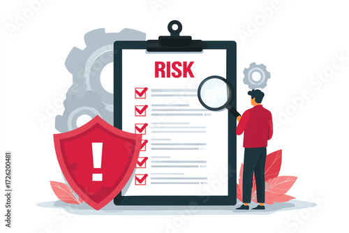 A person examines a detailed risk checklist on a clipboard with a magnifying glass, alongside a shield symbolizing protection and caution in risk management