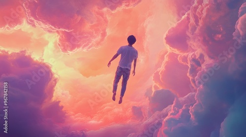 A Person Floating Upwards Through Pink Clouds
