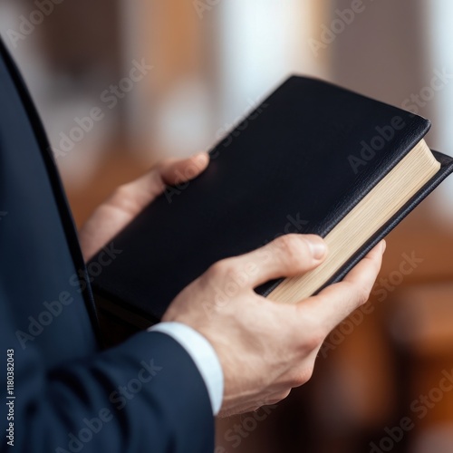 A person holding a black book, symbolizing faith and spirituality in a serene environment.
