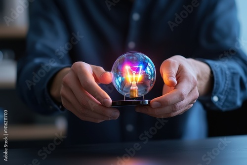 A person holds a glowing light bulb model, showcasing creativity and innovation.