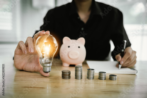 A person holds a glowing light bulb over stacked coins, symbolizing creativity, financial growth, investment strategy, creativity, success, and the connection between money and smart thinking.