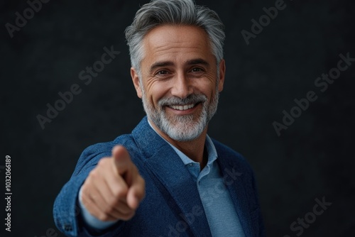 A person in a blue jacket is pointing at the camera, making eye contact with the viewer