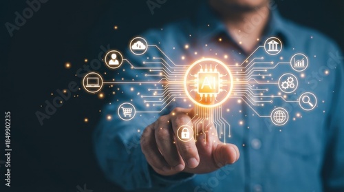 A person in a blue shirt points to a glowing circular object surrounded by smaller white circular shapes and connecting lines