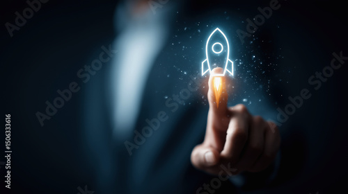 A person in a suit touches a glowing digital rocket icon, symbolizing innovation and startup launch.