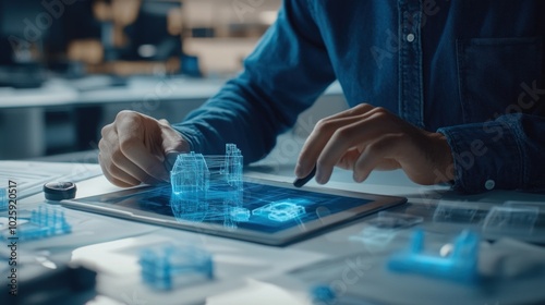 A person interacting with a tablet displaying 3D holographic models for design purposes.