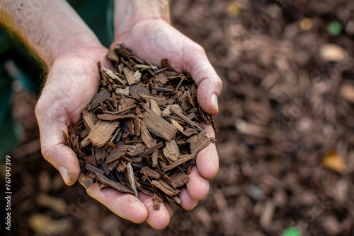 A person is holding a handful of wood chips. Concept of manual labor and the importance of using natural materials for landscaping