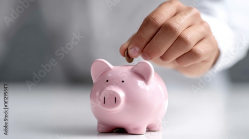 A person is saving coins in a cute pink piggy bank. This image showcases the concept of saving money and managing finances effectively. Ideal for finance and personal savings themes. AI