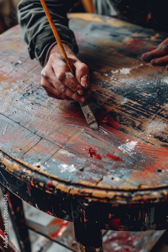 A person is seen holding a paintbrush on top of a wooden table. This image can be used for various creative projects or as a representation of art and craftsmanship