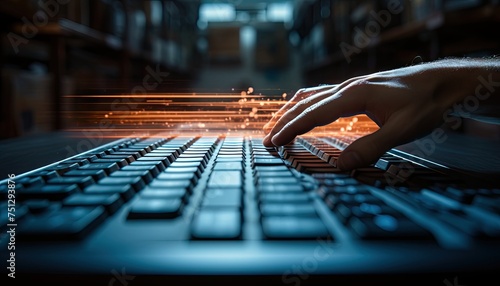 A person is typing on a laptop keyboard in a library, surrounded by shelves of books. The individuals fingers are moving quickly as they work on the computer
