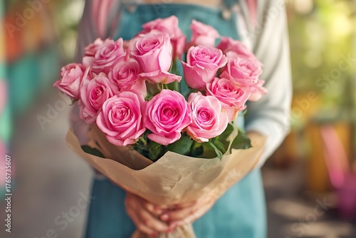 A person joyfully holding a colorful bouquet of fresh pink roses, a gift of love for any special occasion.