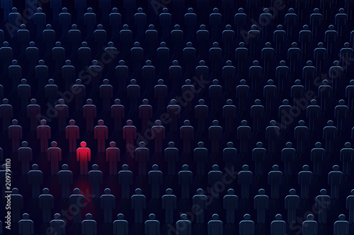 A person marked red among other people. Exceptional individual that could cause danger concept. 3D rendering