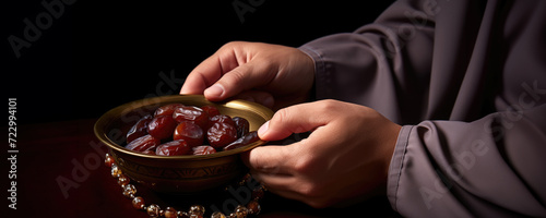A person pouring jam (or honey) into a bowl of fresh dates, Fictional character created by Generative AI.