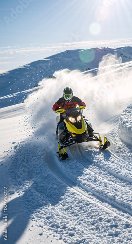 A person riding a yellow snowmobile at high speed through deep powder snow. Vertical action shot of a winter motorsport adventure in the mountains. Extreme sports and recreation concept