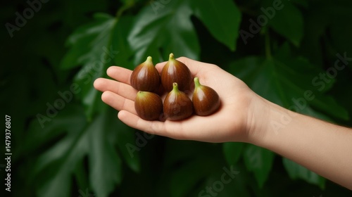 A person s hand gently cupping a cluster of freshly harvested ripe organic figs against a lush green foliage backdrop showcasing the bounty of nature