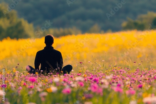 A Person Sits In Silent Meditation In A Field Of Wildflowers. The Gentle Breeze Carries The Fragrance Of The Flowers