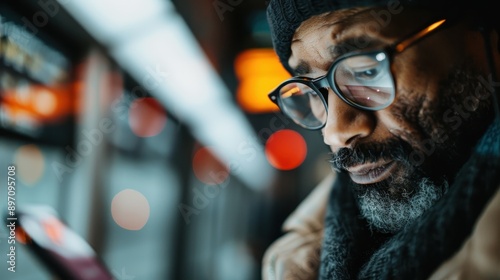 A person sits on a train using their phone, caught in the vibrant lighting of the carriage. The image captures modern transportation and our reliance on mobile devices.