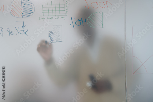 A person sketches charts on a glass board in a collaborative brainstorming session, emphasizing teamwork and creative problem-solving in a modern office environment.