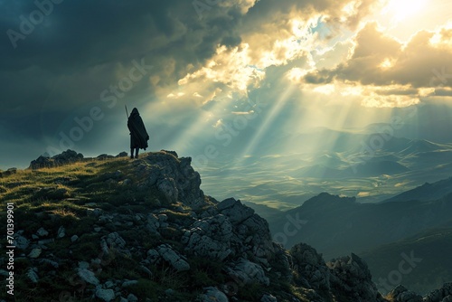 A person standing on a rocky hill with a view of the valley below Generative AI