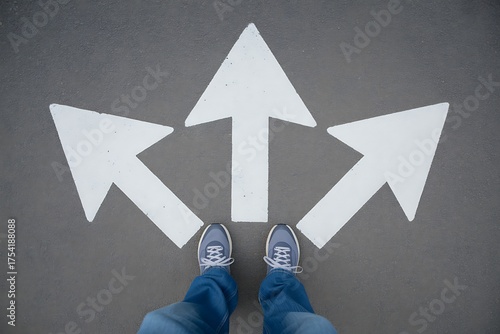 A person stands at a crossroads with three white arrows painted on the asphalt indicating different directions for decision making
