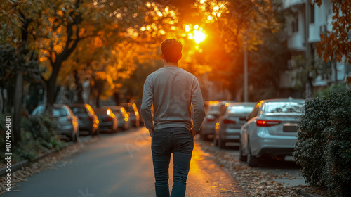 A person strolls down a quiet street lined with cars, enjoying the warm glow of a sunset amid autumn leaves and city scenery