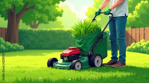 A person using a lawn mower to maintain a lush green lawn in a residential garden